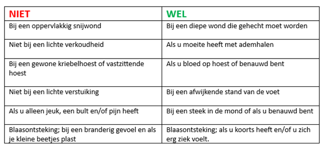 Hieronder enkele voorbeelden wanneer u wel of niet bij de huisartsenpost moet zijn. Twijfelt u? Kijk dan op Moet ik naar de dokter? of thuisarts.nl.